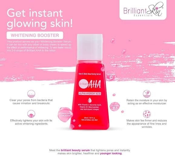 After cleansing and toning, apply an ample amount of Brilliant AHA Serum all over your desired area then blend lightly and quickly.
