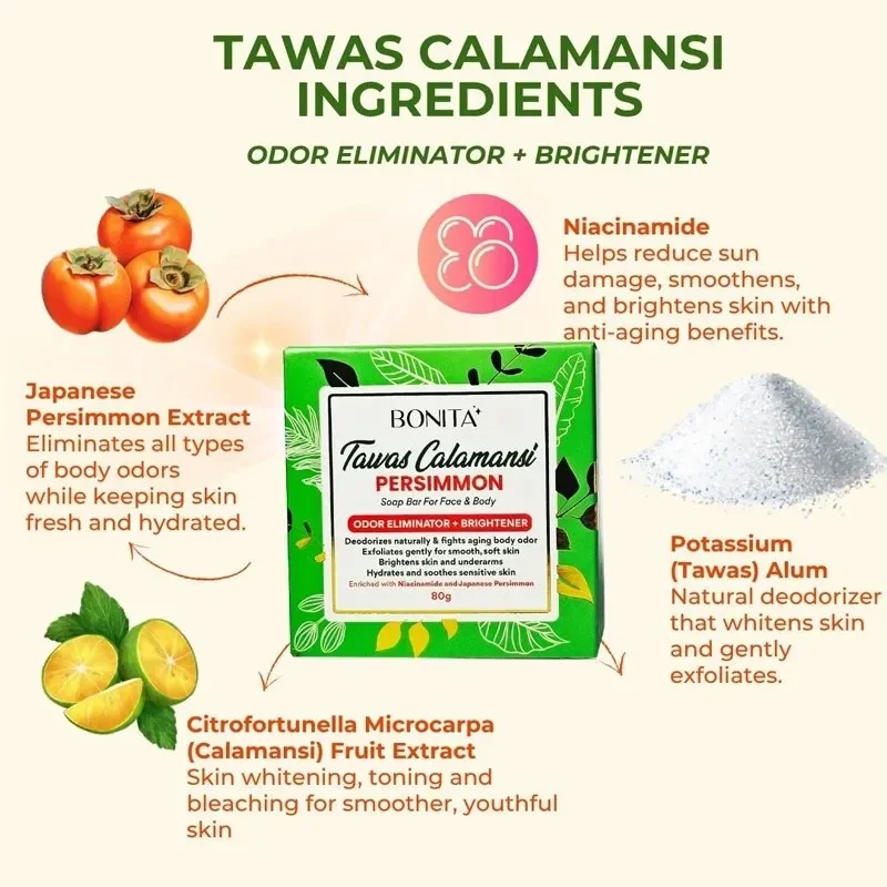 The Bonita Tawas Calamansi Persimmon Soap is a multi-use face and body bar designed to eliminate body odor, brighten the skin, and provide gentle exfoliation using natural ingredients. It is available for purchase from several online retailers.